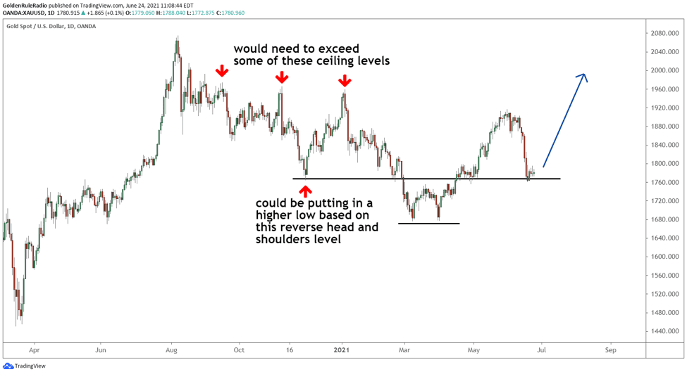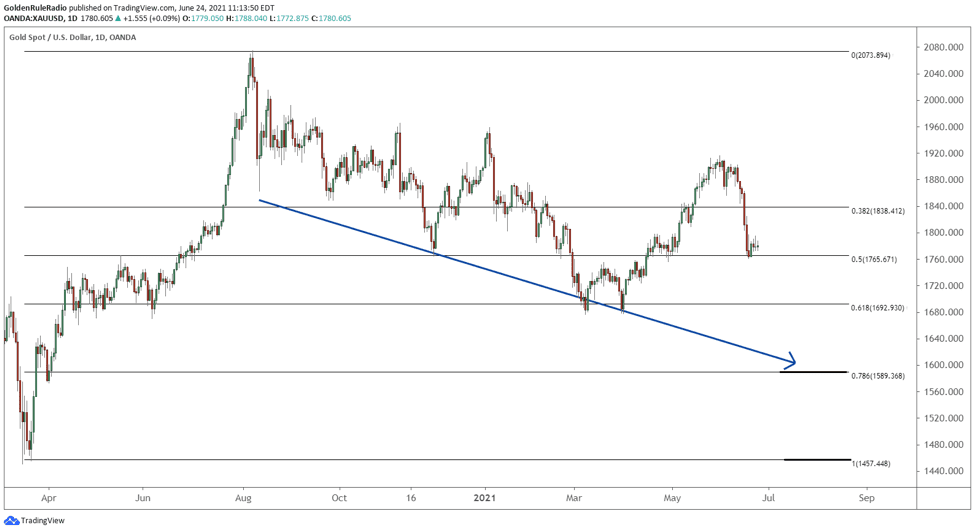 If gold were to continue down, it would need to break through the 50% retracement line and retest the .618 Fibonacci retracement line, which already saw a double bounce in March.