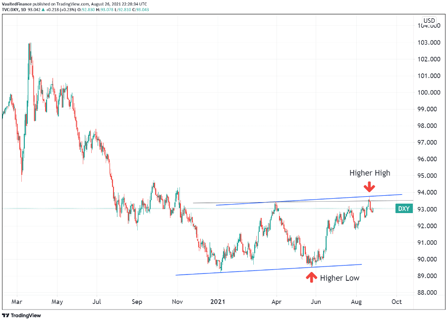 That said, the U.S. Dollar has had a strong year so far. It is rather puzzling to see the Dollar index rise alongside record inflation and near-zero interest rates. If the index measured real purchasing power, it would be dropping off a cliff. But it doesn’t. The index is a weighted value of the Dollar against other fiat currencies, all of which are rapidly losing purchasing power.
