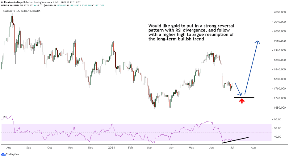 Gold’s price movement in 2021 has created a reverse head and shoulders pattern, which has held steady since the recent drop. A reverse head and shoulders pattern typically indicates a bullish reversal.
