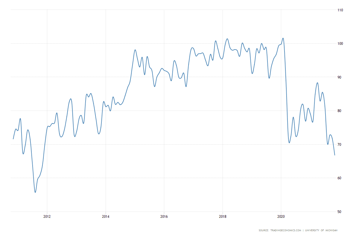 However, all is not rosy in the realm of consumer confidence. The Consumer Sentiment Index (a key benchmark generated by the University of Michigan) fell to 66.8, the lowest level in more than a decade. Economists forecasted a reading of 72.4.