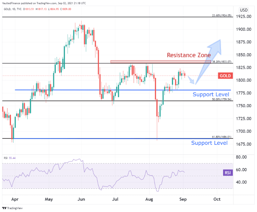 The 50-day moving average is on track to cross the 200-day moving average in the next couple weeks, which would form a bullish signal known as the “golden cross.” This signal, added onto September’s seasonal strength, could be enough to push the price above its $1,837 resistance.
