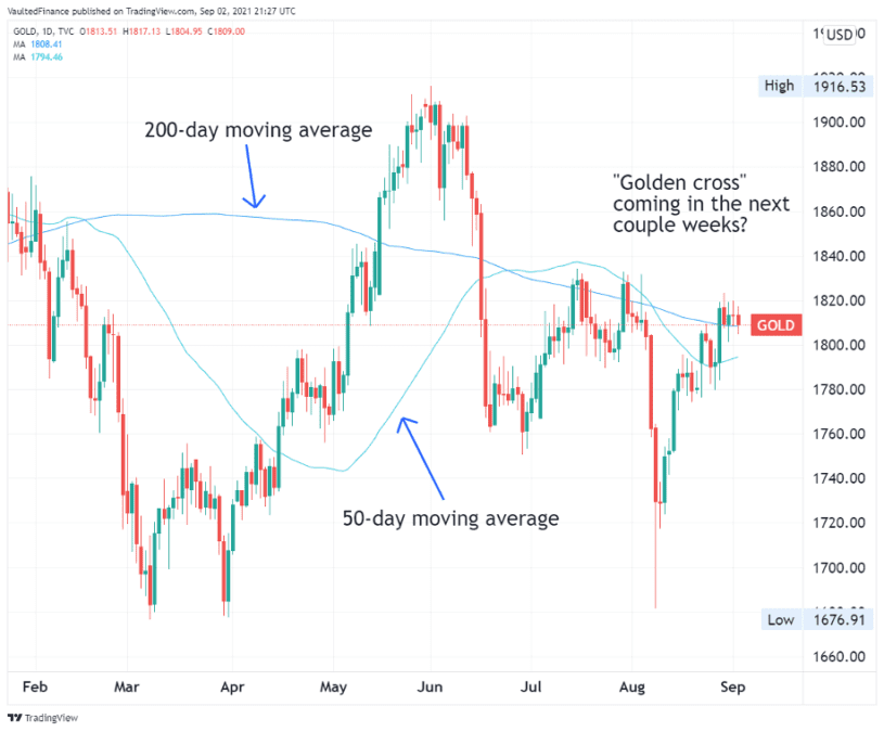 • Gold’s 200-day moving average and 50-day moving average are headed for a “golden cross,” which might be enough to push gold above the $1,837 resistance zone.